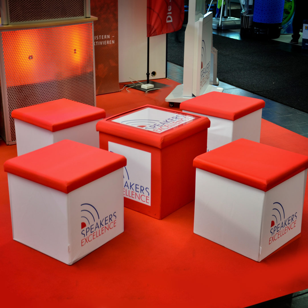 Unsere faltbaren Sitzhocker "BoxSeat®" ersetzen zunehmend die bei Messen und Events als Sitzmöglichkeiten beliebten Schaumstoff Sitzwürfel, da die faltbaren Sitzhocker deutlich einfacher zu transportieren sind und durch den zusätzlichen Stauraum bei Messen und Events auch noch als Aufbewahrungsboxen genutzt werden können. Die Drucke werden über Klettband fest mit dem Falttisch verbunden und ermöglichen so zusätzlich einen problemlosen Austausch.
