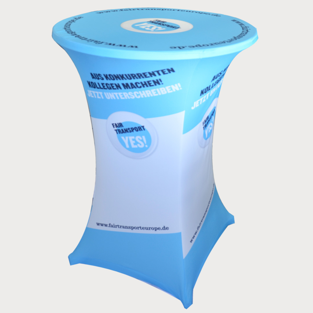 Stehtischhussen sind die ideale Lösung um Stehtische auf Messen und Veranstaltungen als Empfangsmöglichkeiten mit Ihrer Werbung oder Logo zu branden. Ebenso können Sie ihre Stehtische so vor Witterung und Schmutz schützen.