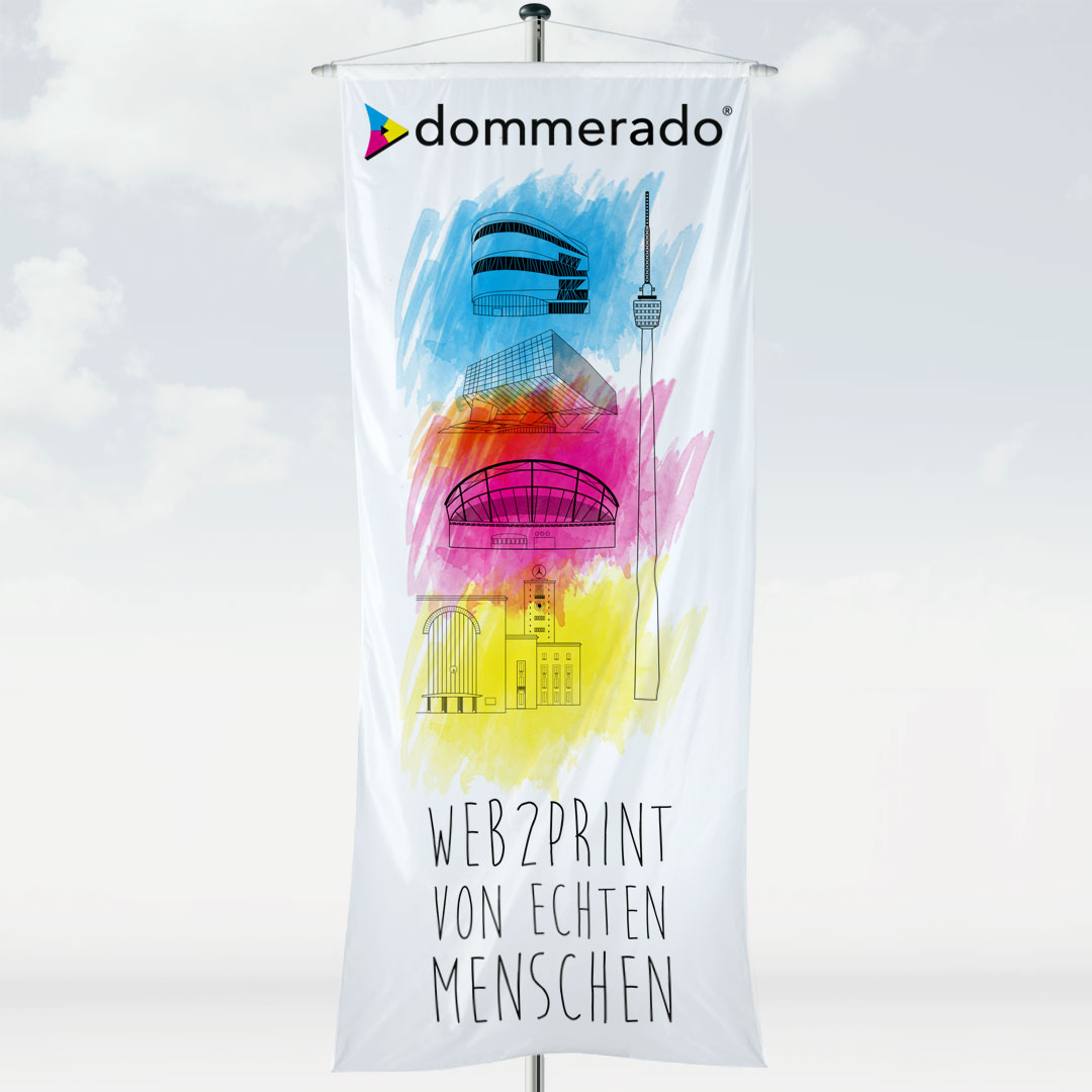 Die klassische Bannerfahne gehört zu den ältesten Fahnenarten. Sie wird meist von Städten, Gemeinden und Vereinen eingesetzt. Bannerfahnen können an jedem Fahnenmast befestigt werden und der Bannerstab verhindern das Zusammenklappen der bedruckten Fahne. Dadurch ist die Bannerfahne perfekt für Out of Home Kampagnen im öffentlichen Raum oder an gemieteten Fahnenmasten geeignet. Die Bannerfahne wird an der Oberkante mit einem Hohlsaum gefertigt; in diesen wird ein Holzstab eingeschoben und mit zwei weiß lackierten Holzabschlusseicheln sowie einer Seilaufhängung (mit Metallkarabinerhaken) befestigt. Wir empfehlen Ihnen, Bannerfahnen zusätzlich mit einer Flatterbremse oder einer Ringbandsicherung auszustatten. Durch diese Zusatzausstattung lässt sich ein unerwünschtes Hochwehen und starkes Schlagen der Fahne im Wind verhindern.